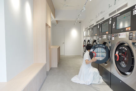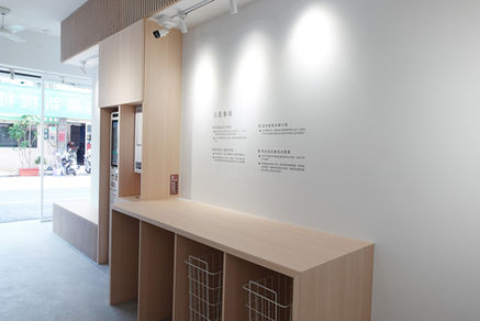 木質色調搭配淺灰,讓整體呈現柔和感,也希望帶著衣物前來的客人們,也能在此空間裡,感受美的存在:衣物洗滌,從亂理出序,帶著清潔舒爽的心情離開,迎接整日的好心情。